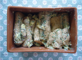 4. Den Hefeteig durchkneten, auf der bemehlten Arbeitsfläche zu einem Rechteck ausrollen und die Kräuterbutter gleichmäßig darauf verstreichen. Den Teig längs in fünf Streifen schneiden. Die Streifen jeweils ziehharmonikaartig zusammenfalten, senkrecht in die eingefettete Rechteck-Terracotta-Form (T 4) geben, mit einem Tuch abdecken und an einem warmen Ort nochmals ca. 15 Min. gehen lassen.